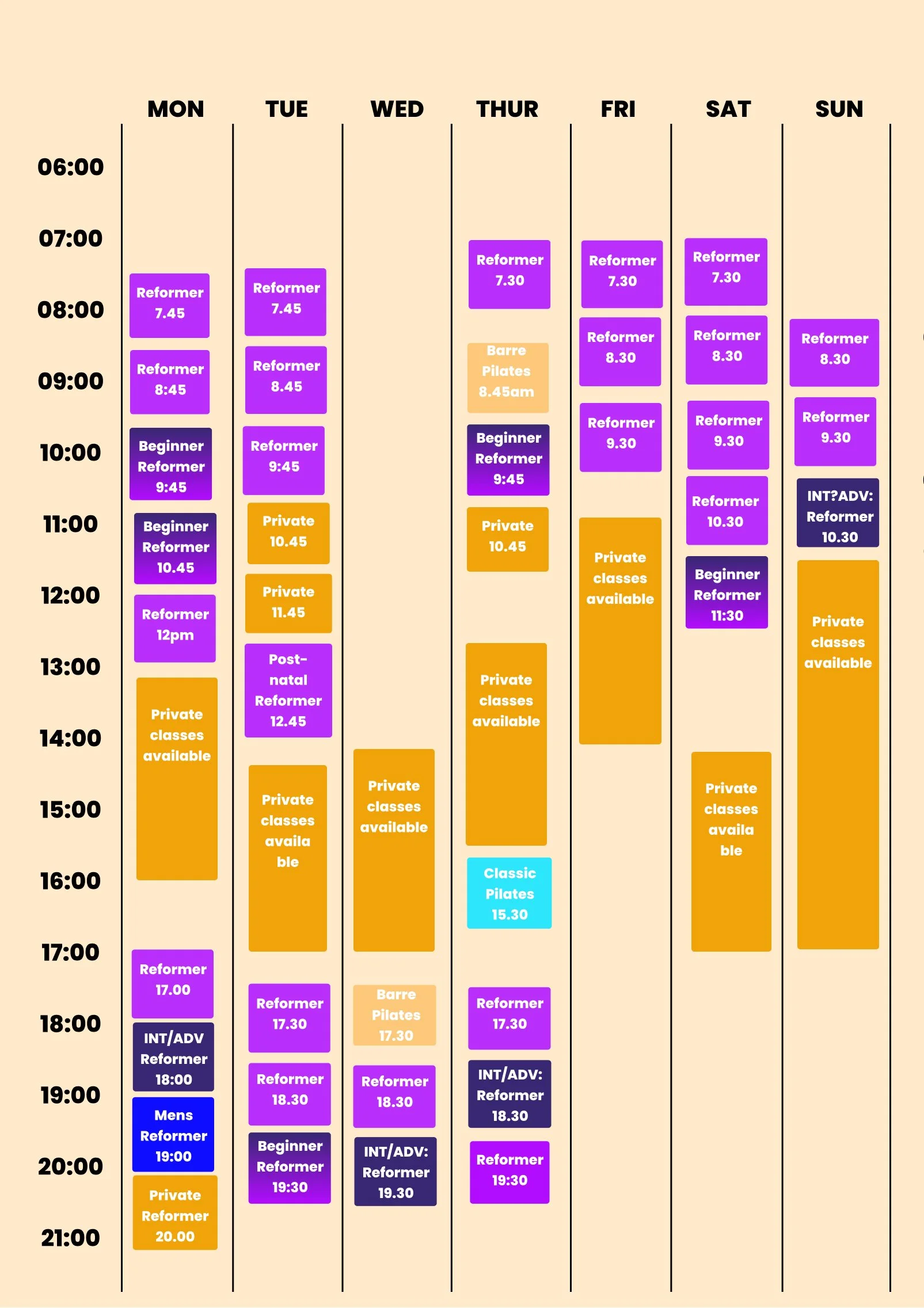 The Studio is open 7 days a week, offering small group classes. Private Classes can be booked by calling Alison
